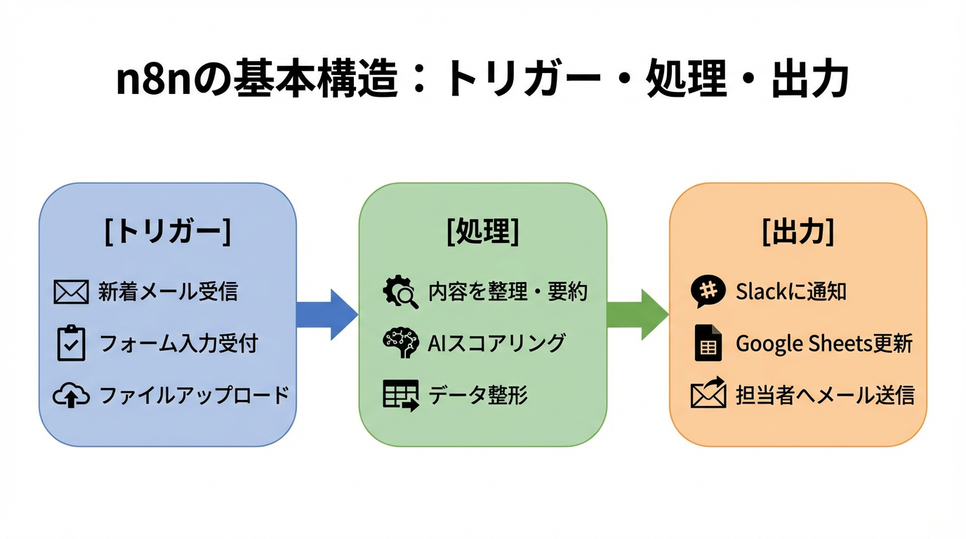 【図】n8nの基本構造 のように、すべての自動化はこのシンプルな3ステップの組み合わせで成り立っています。