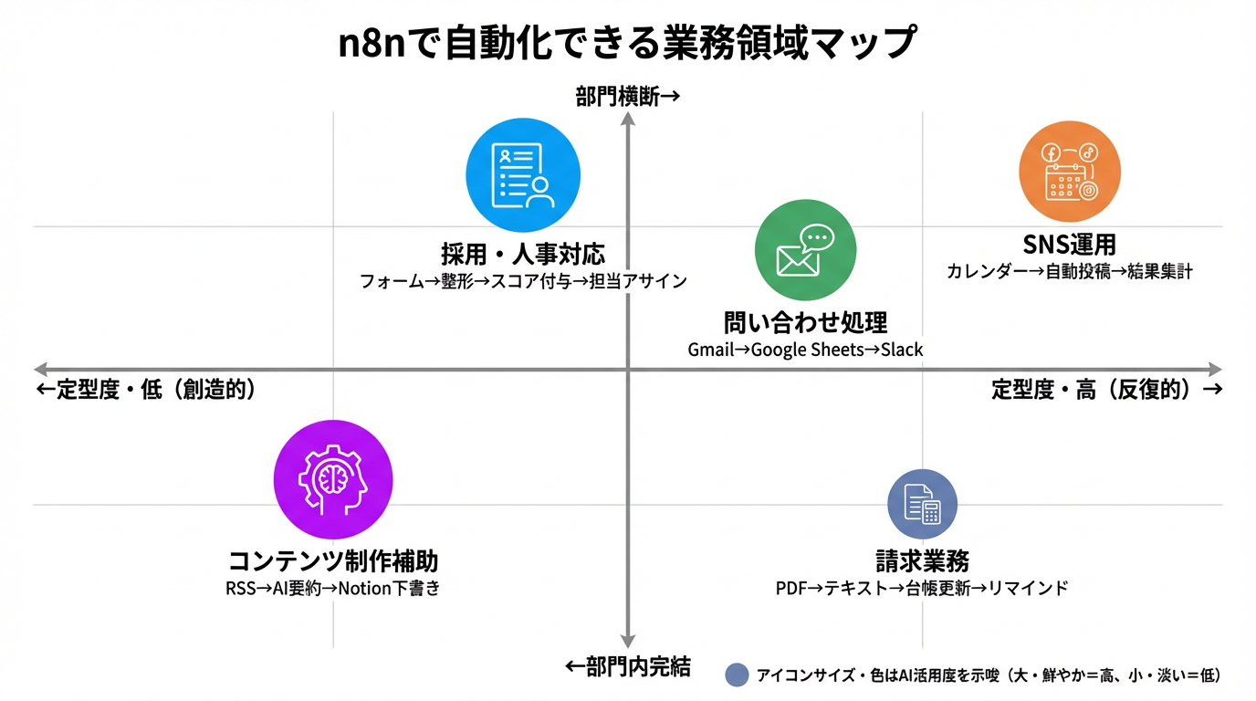 ここまで紹介した5つの例を【表】中小企業の業務自動化 活用例一覧 にまとめました。自社のどの業務に近いか確認してみましょう。さらに、【図】n8nで自動化できる業務領域マップ を見ると、これらの業務がどのような特性を持つか全体像を把握できます。